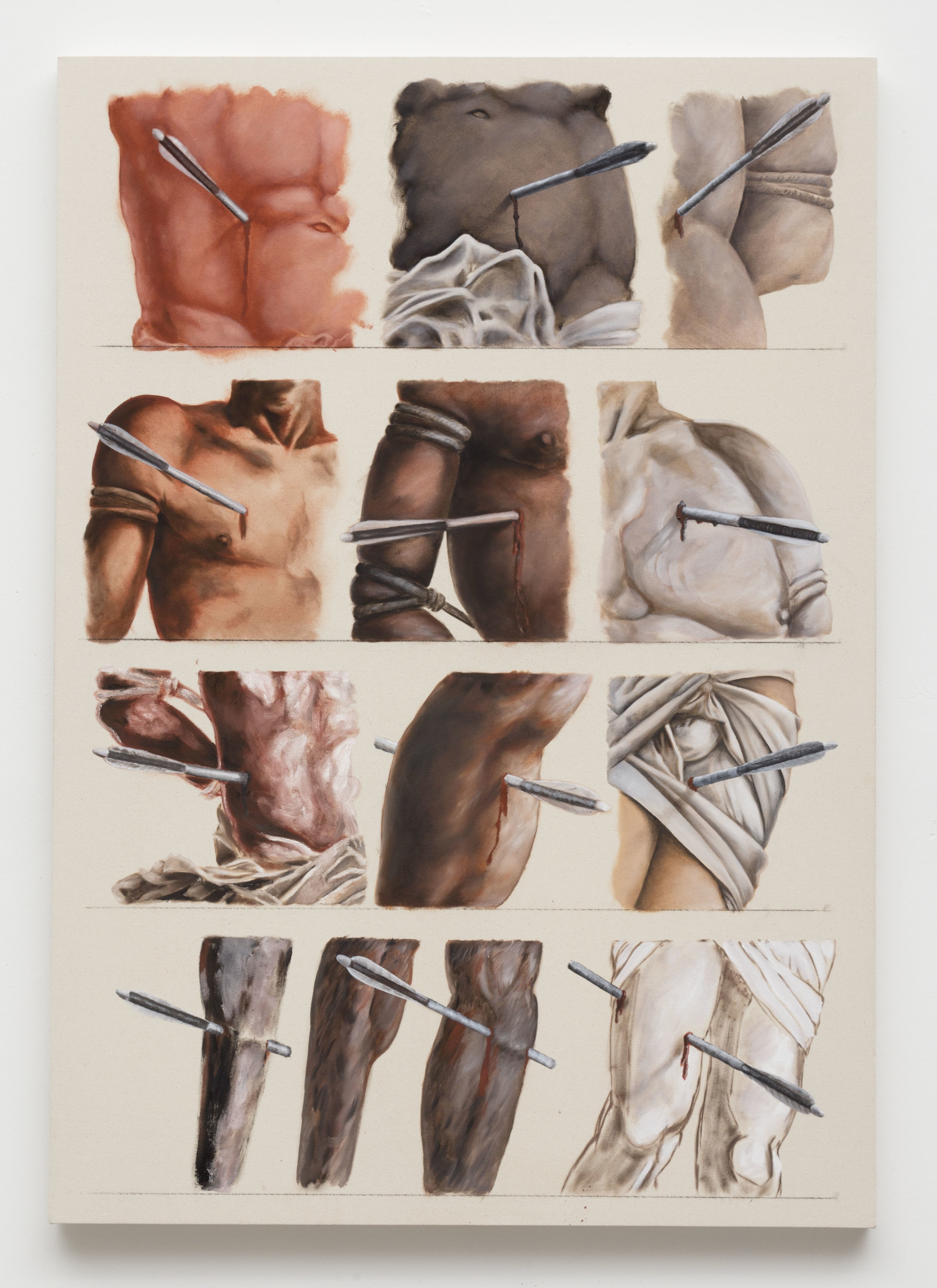 I favor this gridded and repetitive format because it gives me the room to do both. The paintings can take a lot of abuse; so long as there are one or two representations of the subject that are close to a signifier that the viewer is familiar with (a duck-looking duck, a banana-looking banana), the game of representation suddenly inverts and there is endless room for distortion and alienation. Typically, in representation, we strive to get close enough to saying the thing without being didactic or obvious. But if I paint a bland duck-looking duck in one portion of the painting, it becomes painfully boring to paint or look at a duck-looking duck a second time. I am launched into this fight over and over again to find some new way to see and say “duck!” To win the fight and keep the painting interesting, I have to push the physical qualities of paint and stretch the conceptual framework of the signifier.