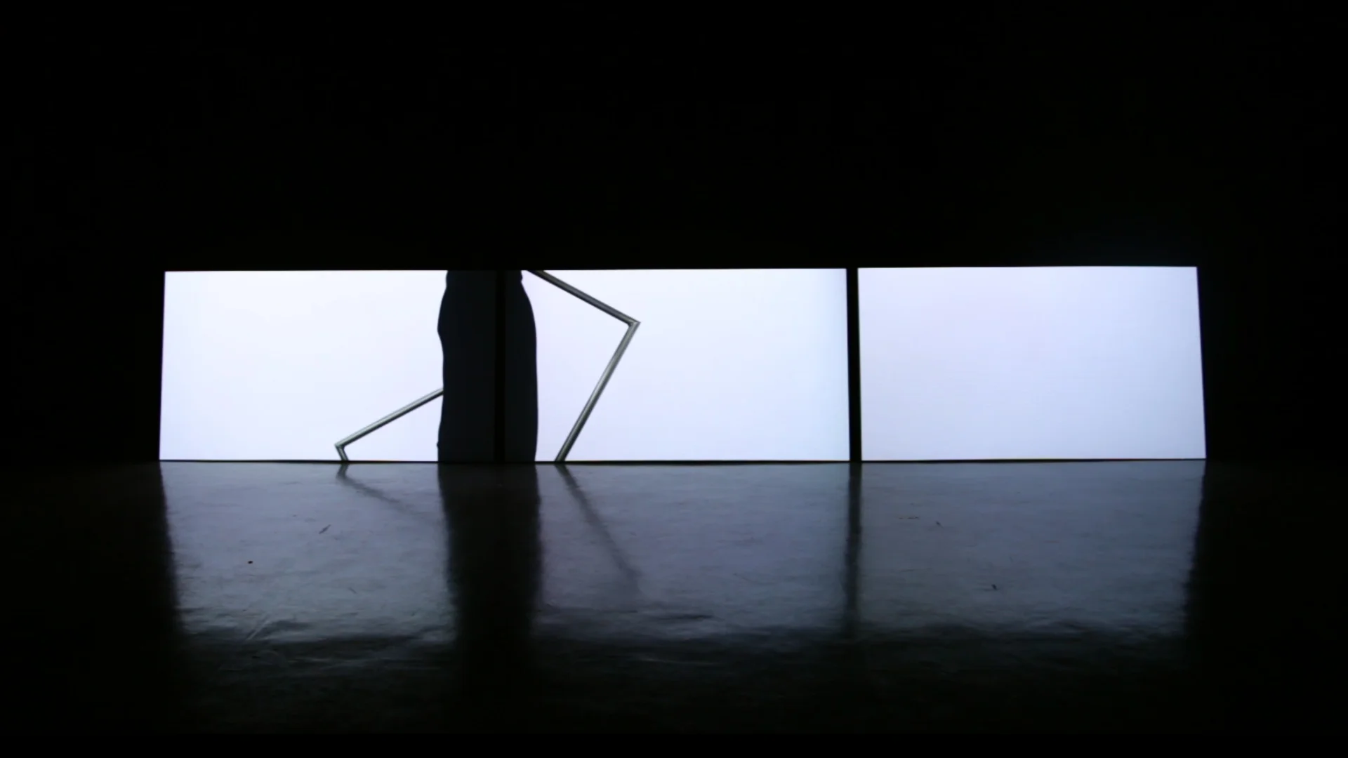 Body/enclosed space/bars of metal: I find it interesting that you view my body to be restricted within my work as this suggests passivity. Whereas, I understand the body to hold an active relation to both the digital frame and the metal prosthetic. In “Linear Modality”, the metal prosthetic might appear restrictive, with its materiality suggesting weight and rigidity. However, balancing during moments of delicate, almost non-existent contact, its effortless gliding across the body subverts these qualities. A modernist symbol of industrial precision, the body employs the metal prosthetic in order to extend between previously impossible geometric positions.