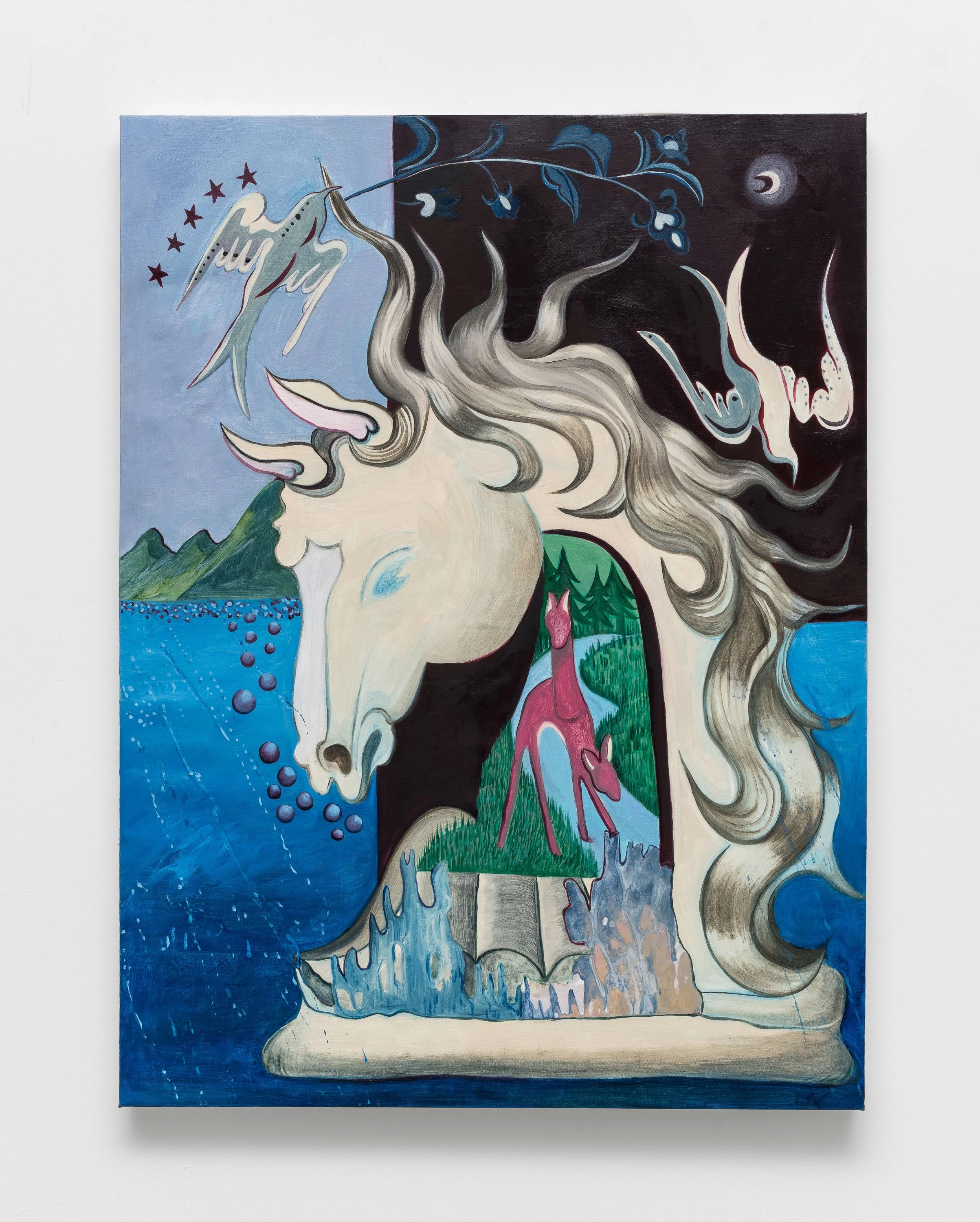 In my practice, these creatures become vessels through which I process the complexities of identity. They inhabit fantastical, surreal spaces that are neither here nor there—neutral worlds that reflect the fluidity of belonging. These environments offer a sense of refuge, mirroring my desire to create spaces where those who have experienced cultural dislocation might find recognition, resonance, and connection. Through these beings, I am continuously building a visual language that speaks to the in-between: between places, identities, and emotional states.