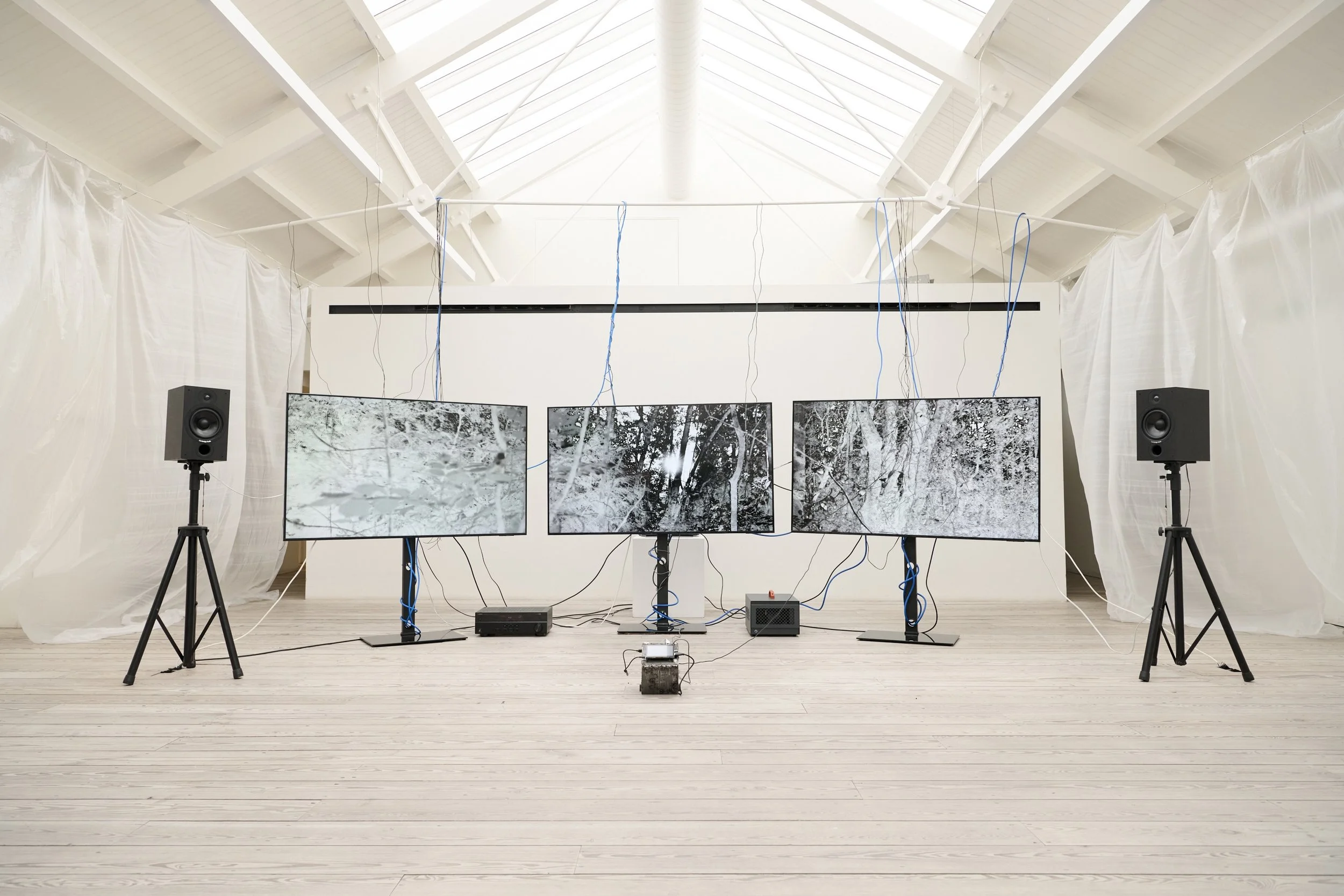 The presentation of your work combines sculpture, sound, and multi-screen projection, creating a space that feels part cinema, part ritual. How do you think about installation as a way to shape how viewers physically and emotionally experience your works?