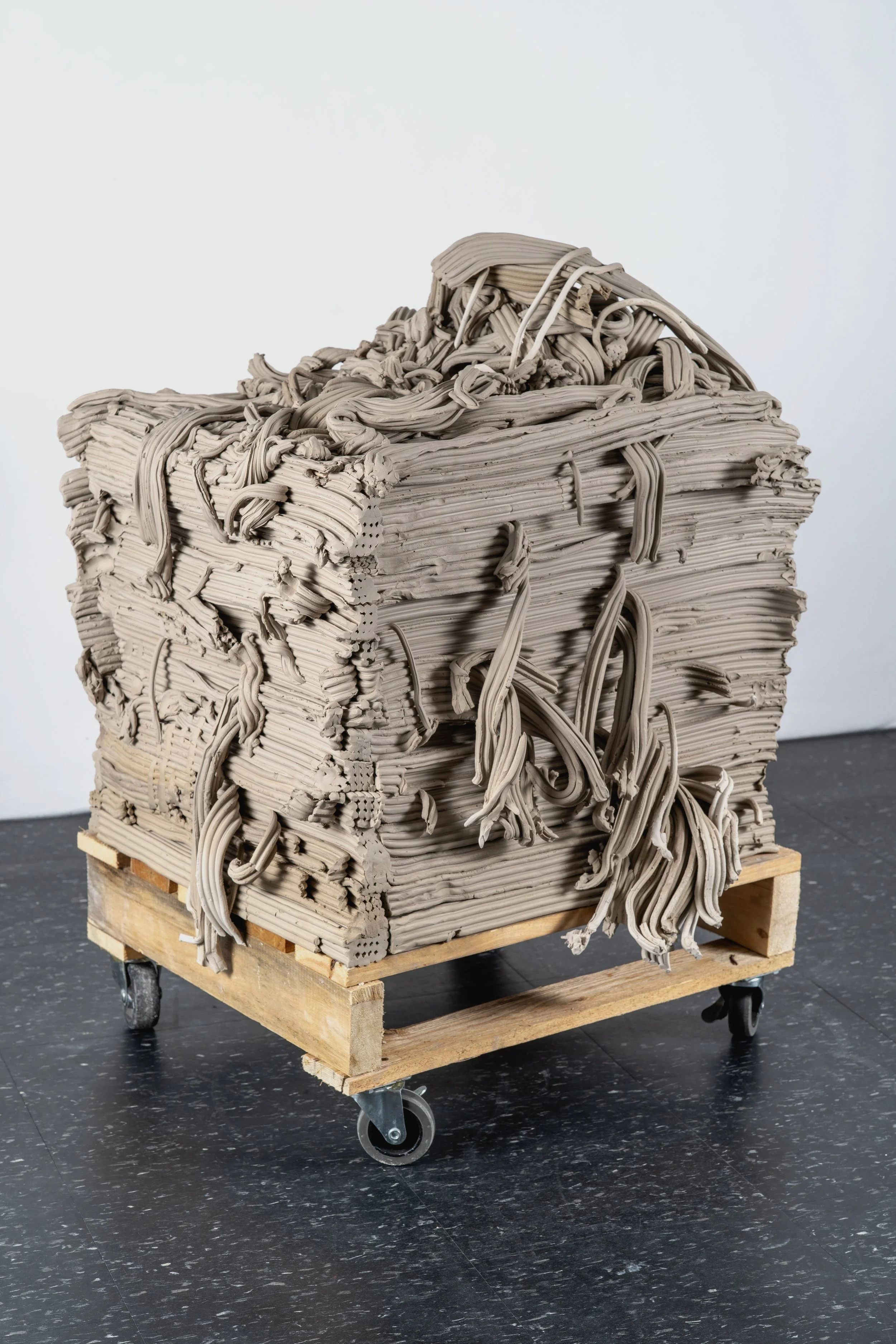 Back in August I made some large unfired clay sculptures on wooden palettes using an extruder in situ at McLennon Penn gallery in Austin as part of a duo exhibition titled ‘Ortland Leathe’ with an artist called Selina Wagner. Unfortunately I had to destroy them at the end of the show as they were too fragile and cumbersome to be transported to a kiln. I have just started a ceramics residency at The Dougherty Arts Center in Austin and I’d like to use my time there figuring out how to fire this type of large scale work.