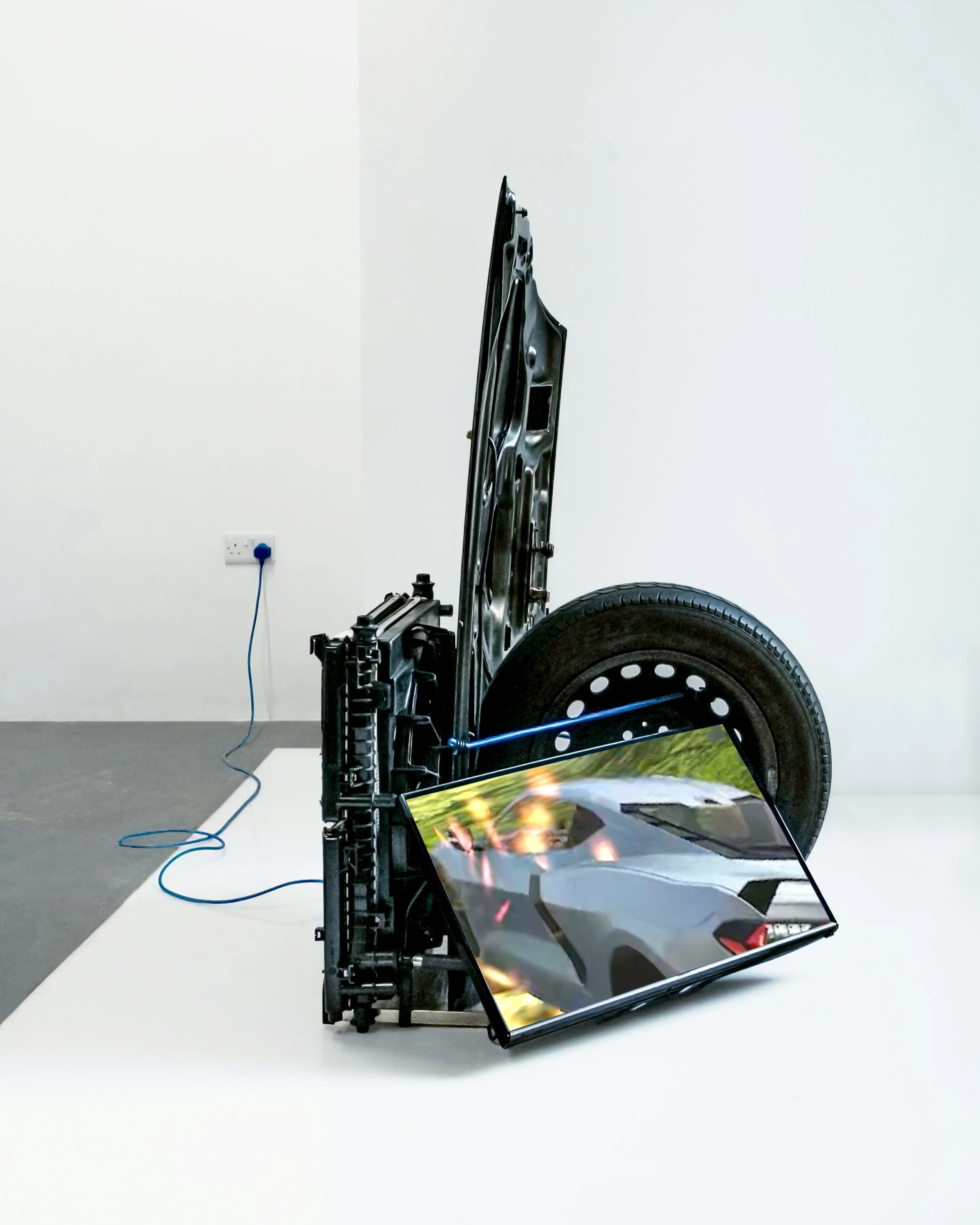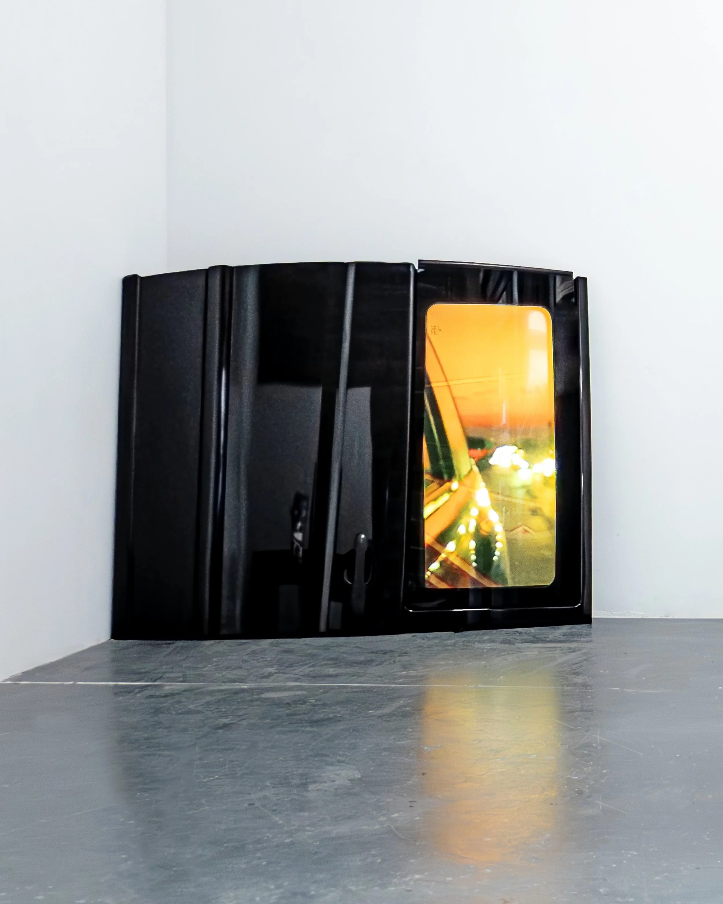 Recently, I’ve been exploring how digital-born moving image works can exist within the medium of sculpture. I’m interested in translocating short-form videos from the ephemeral, incorporeal environment of online media and digital archives, and embedding them within physical structures. Routinely swiping between the same set of apps, and scrolling the same, ever-refreshing algorithmic streams on personalised interfaces, constitutes an incredibly addictive comfort zone. The consumption of moving image content becomes an almost disembodied process, operated via minuscule physical gestures. In my work, I’m interested in disrupting this comfort zone, and turning the experience of watching videos that would naturally be scrolled past, viewed on palm-sized screens, into something potentially visceral, ineluctable, where viewers and videos now occupy the same physical space.