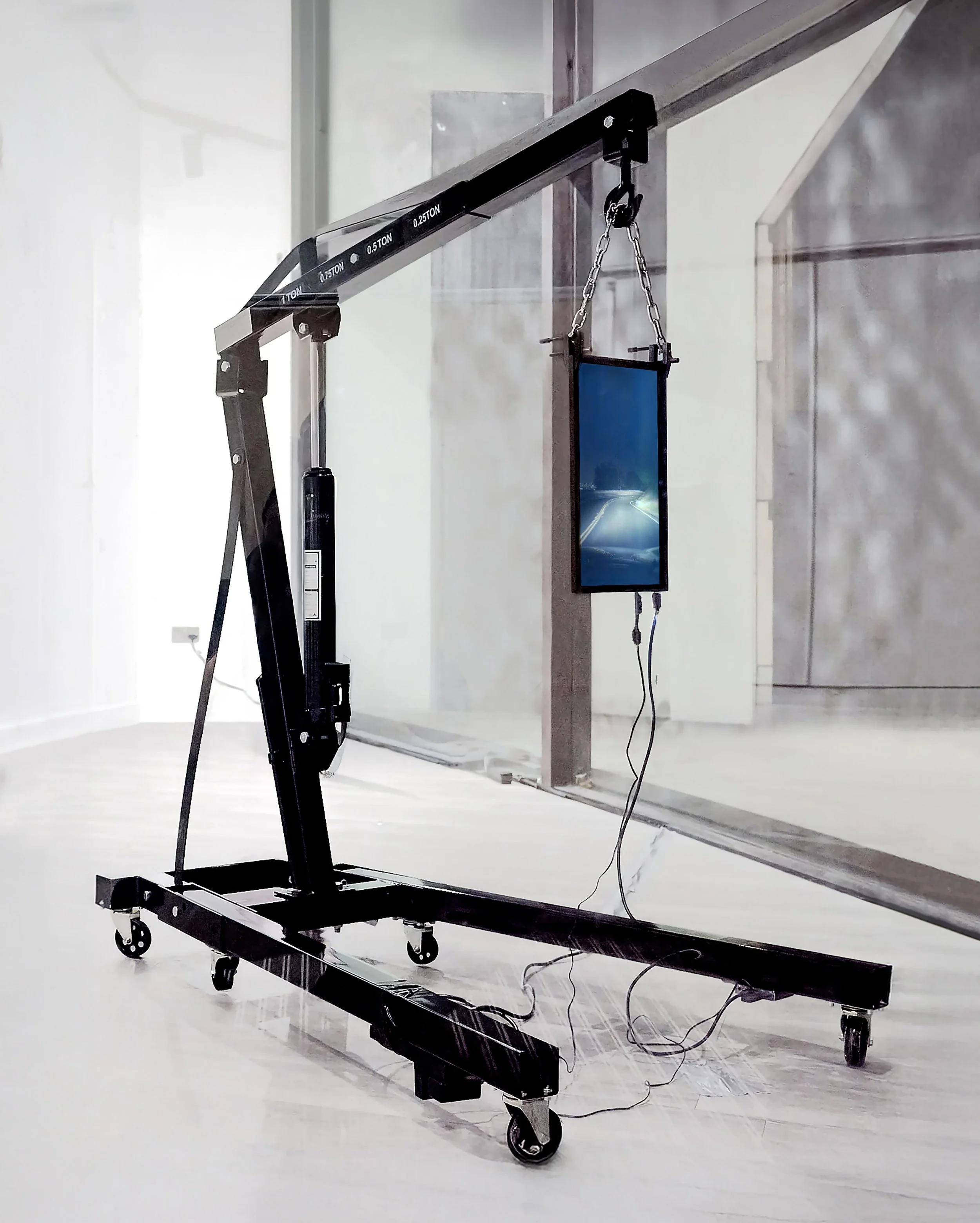 Several of your works combine moving image with sculptural structures, such as screens mounted on cranes or angled display systems. How does the physical framing of the video shape the way viewers encounter the work?