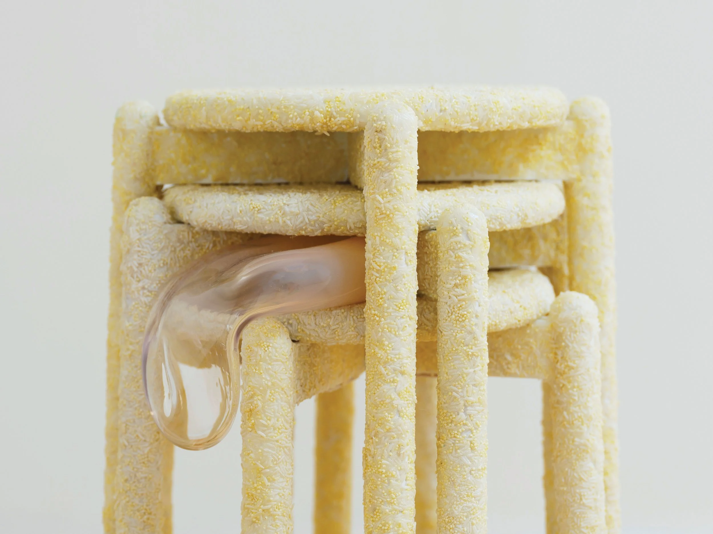 It was during this time that I began paying closer attention to care objects—objects designed to support memory care, as well as those meant to assist with physical limitations. I became particularly interested in the overlap between objects designed for elderly care and those created for children. Many of them serve dual purposes, supporting both the acquisition of new knowledge and the ability to remember. I started thinking about how the physical actions of learning and forgetting can overlap, and how the intuitive gestures of children’s play can also resemble acts of remembering. This overlap has informed many of the decisions I make in my process. The multisensory potential inherent in my chosen materials is central to the environments I hope to create. I am interested in how visual, tactile, and olfactory experiences shape the way we perceive an environment. In many ways, I hope my work can convey the frustrations caused by the inability to interpret and assign meaning to familiar surroundings. I also use food and related materials as key elements, including ingredients such as rice, millet, enoki mushrooms, and brisket noodle soup. This process is inherently time-based, as I experiment with ways to transform and integrate food into semi-permanent, constructible materials, allowing the work to engage more closely with the sensory dimensions of caregiving.