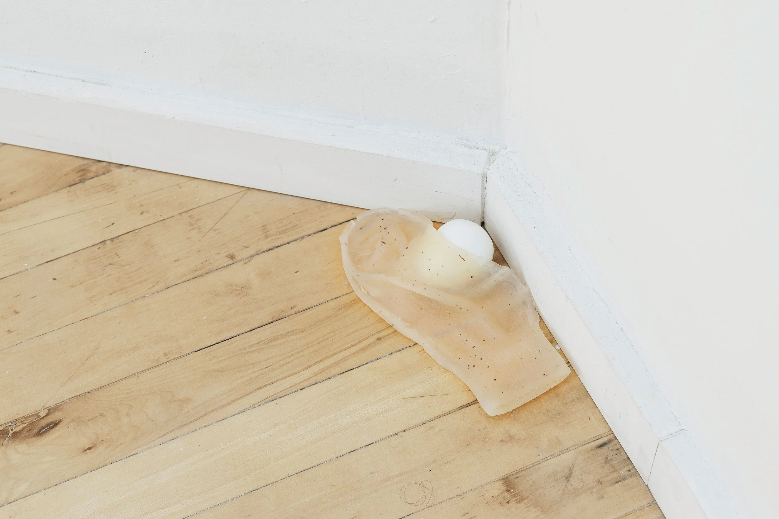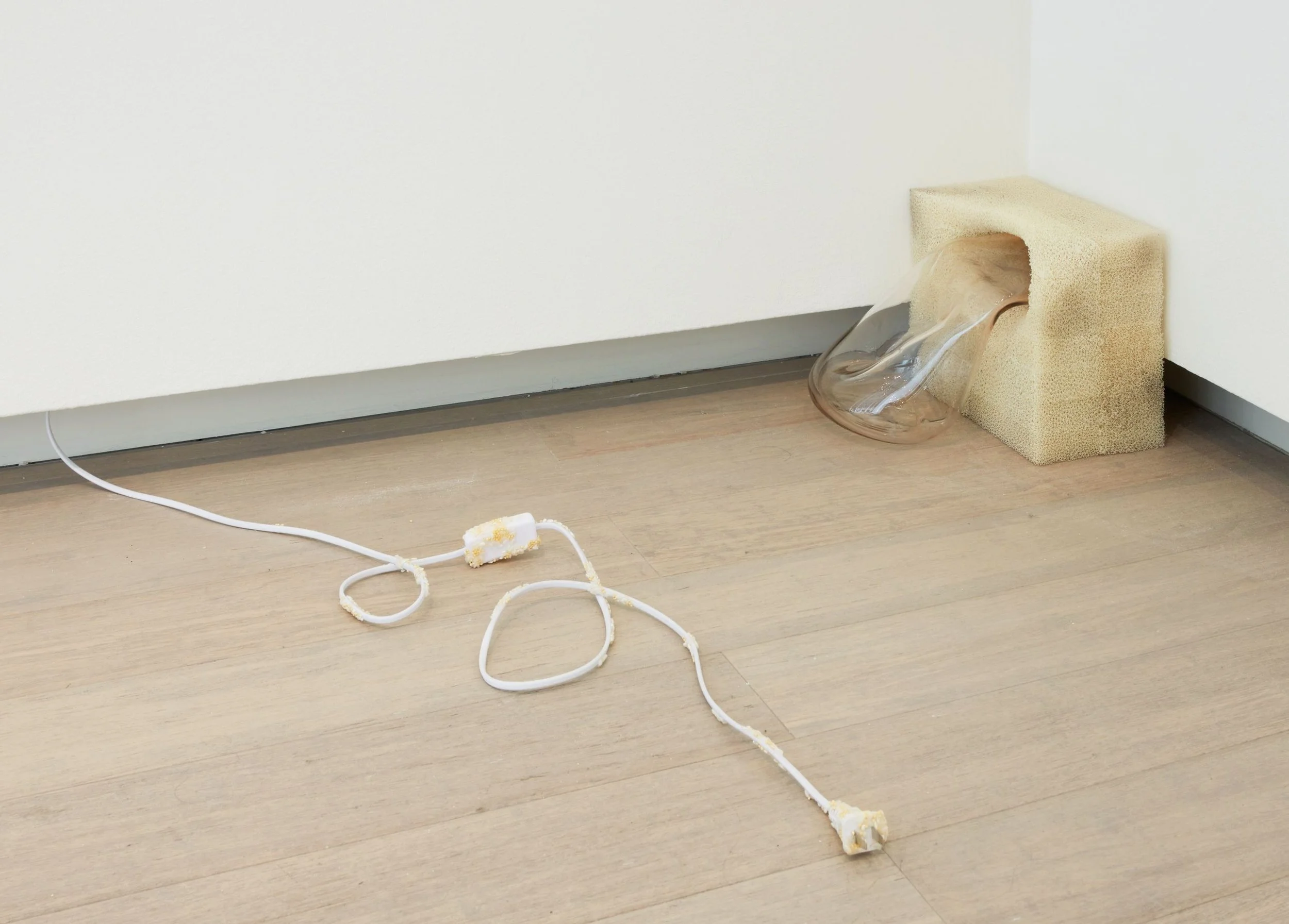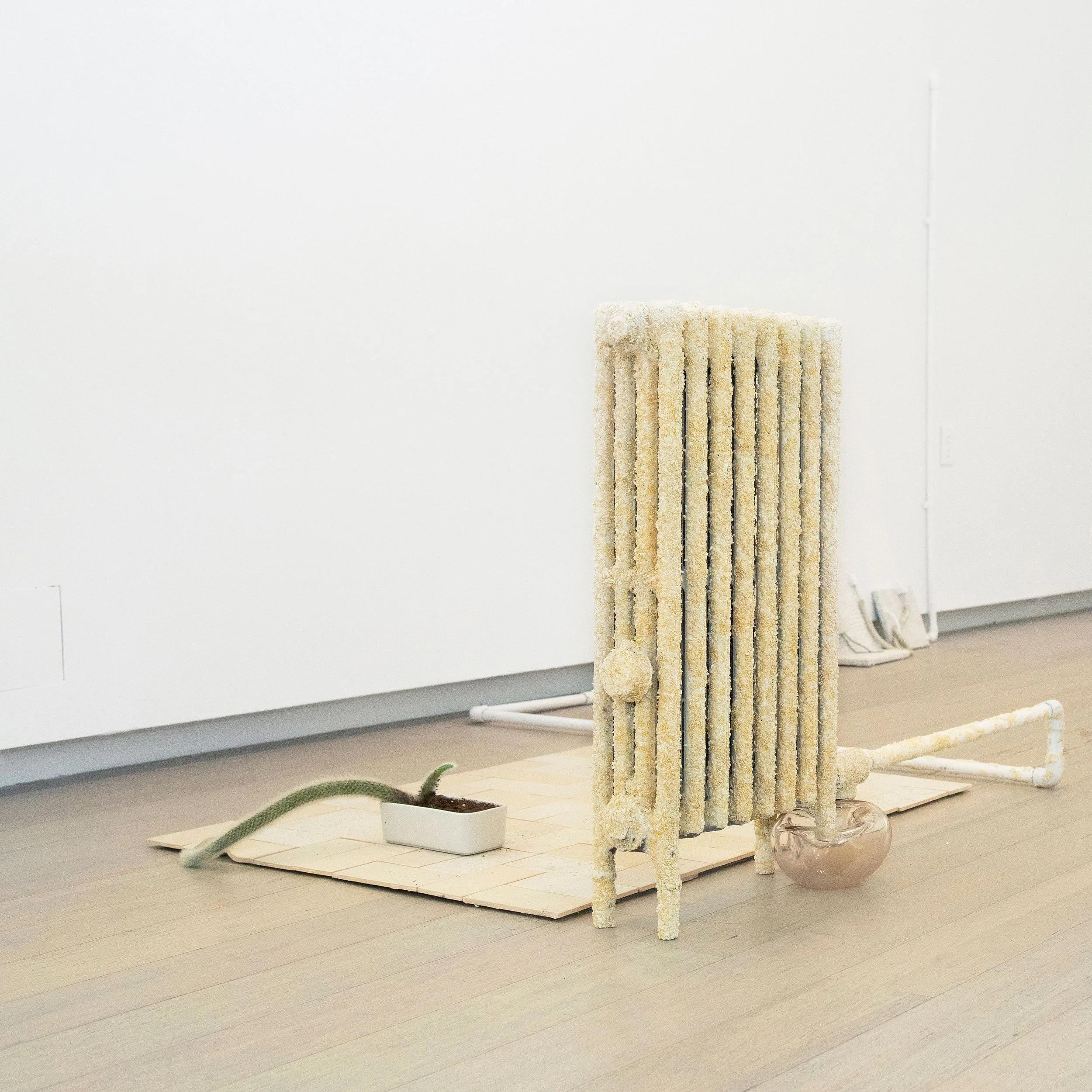 I studied photography during my undergraduate years, but later shifted my focus toward sculpture and installation-based work. Because I did not have the opportunity to receive formal training in many sculptural techniques, I began experimenting broadly with materials, testing different processes as a way of developing a sculptural language that could resonate more closely with my ideas. I now realize how fundamental those open-ended explorations were to the work I make today. Not limiting myself to a single material or process helped me develop a way of working in which different elements can come together with a sense of cohesion. When it comes to deciding how materials are integrated, I often think about how an arrangement might intensify the emotional charge embedded in familiar objects. In my work, I incorporate recurring elements and motifs reminiscent of environmental enhancements often found in senior care facilities, transforming them through shifts in material, placement, scale, and juxtaposition. Each work develops through a slightly different process, but I am generally interested in moments when seemingly contradictory materials meet and interact.